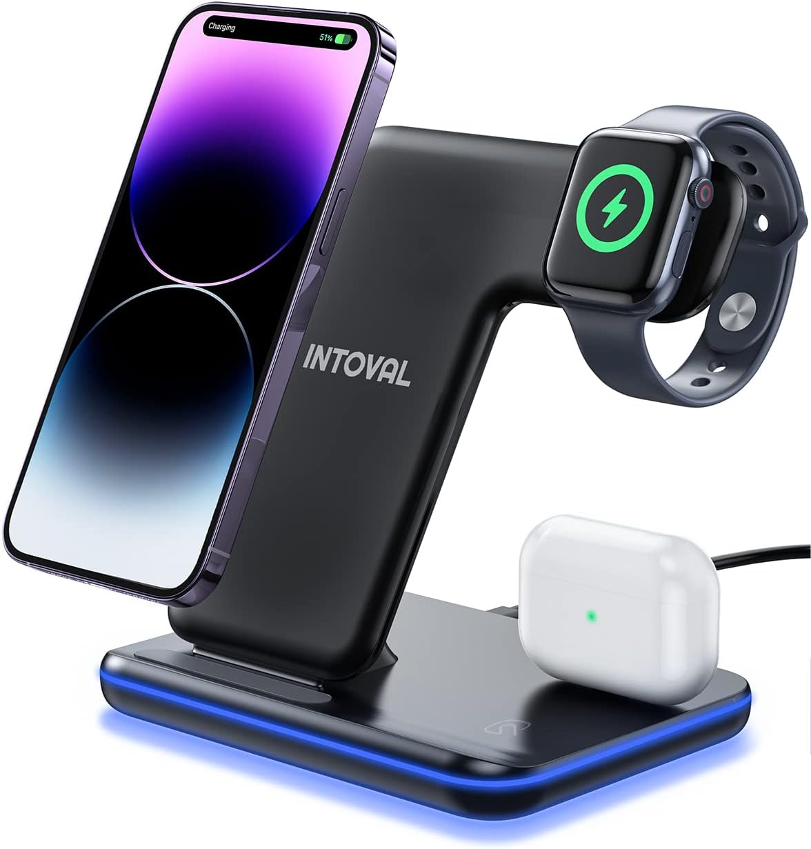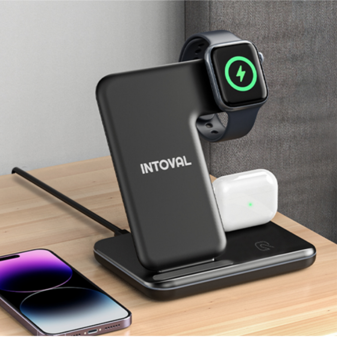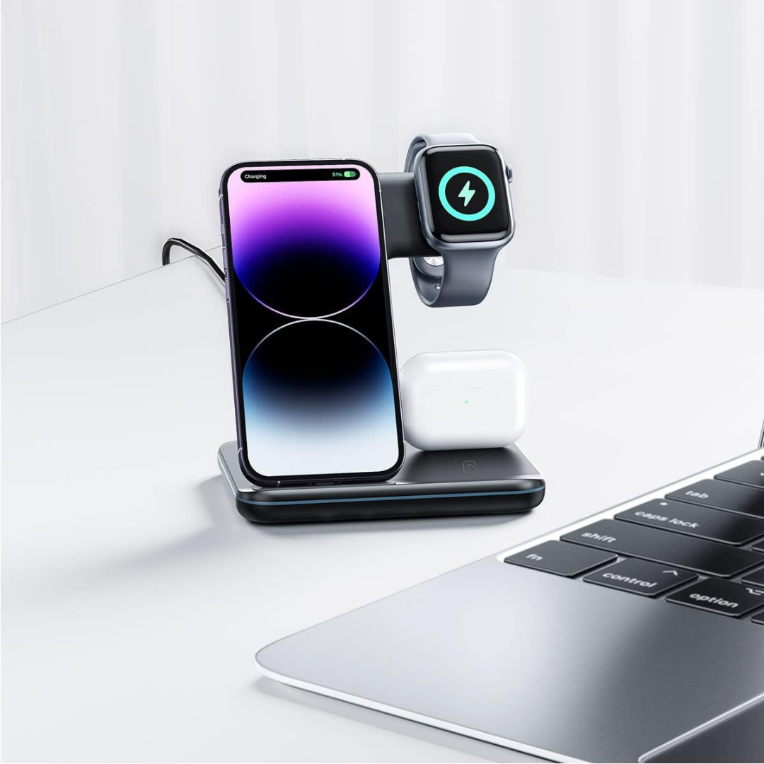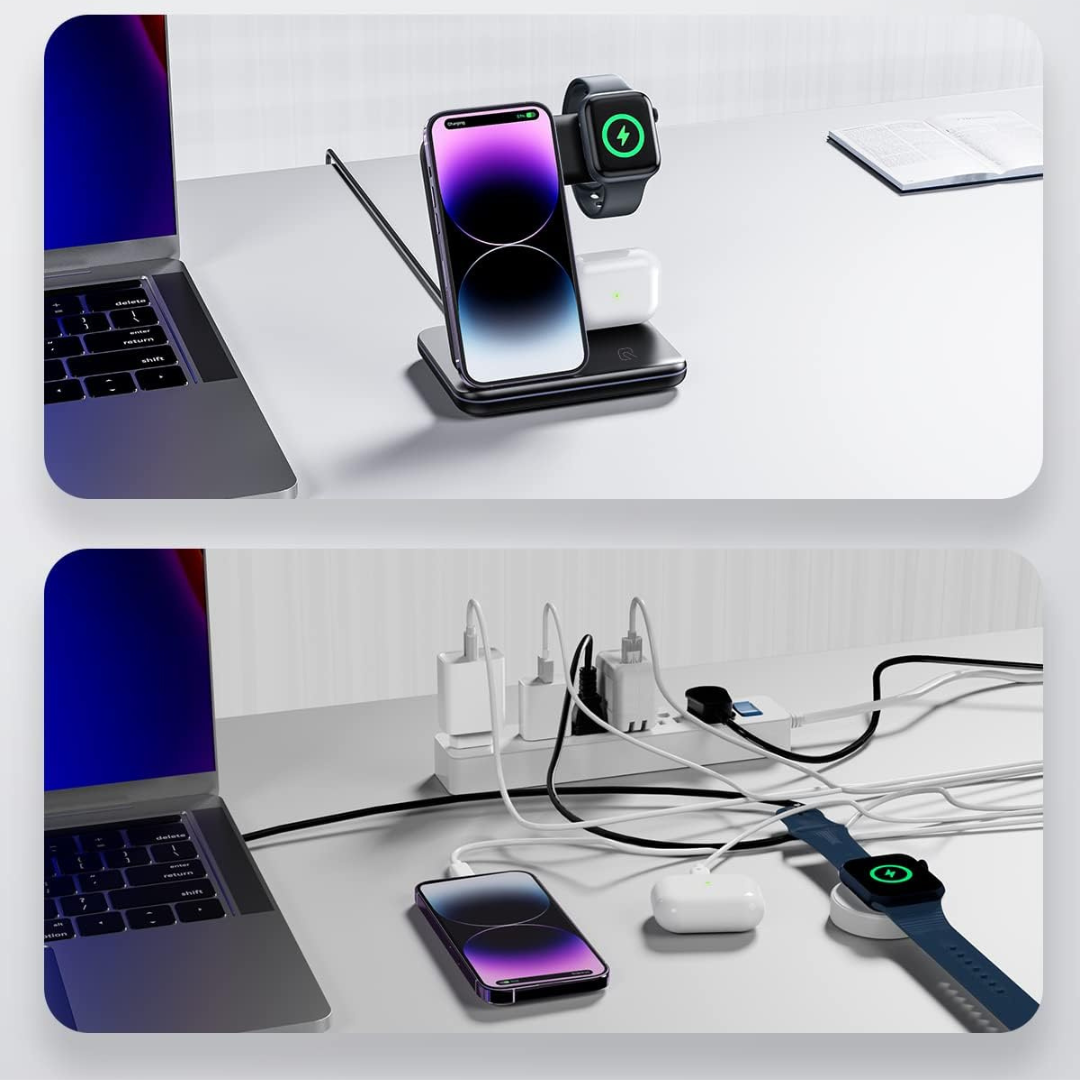 Diseño mejorado y chip interno que garantizan una carga inalámbrica segura y rápida. Un dispositivo de carga para iPhone, iWatch y Airpods/Pro.